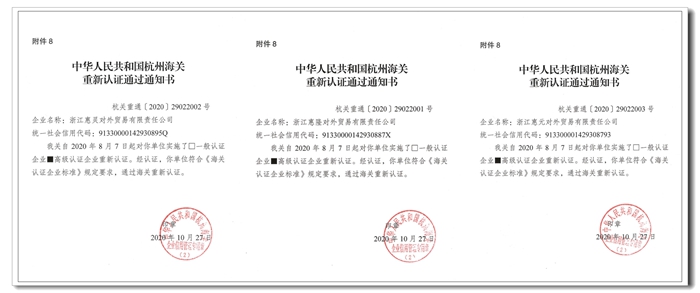 日前,公司下屬浙江惠元對外貿(mào)易有限責任公司、浙江惠靈對外貿(mào)易有限責任公司、浙江惠隆對外貿(mào)易有限責任公司收到了杭州海關簽發(fā)的《重新認證通過通知書》,成為今年杭州關區(qū)首批通過AEO高級認證重新認證的企業(yè)。