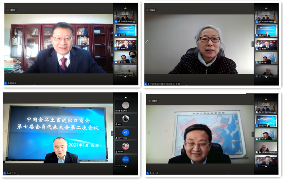 根據(jù)中國(guó)食品土畜進(jìn)出口商會(huì)章程規(guī)定和工作安排,考慮到當(dāng)前新冠疫情防控總體要求,2021年1月26日,食土商會(huì)以線上視頻會(huì)議方式召開(kāi)了第七屆會(huì)員代表大會(huì)第二次會(huì)議。本次會(huì)議應(yīng)到會(huì)員代表265名,實(shí)到代表189名,超過(guò)應(yīng)到代表的三分之二,符合商會(huì)章程規(guī)定人數(shù)。